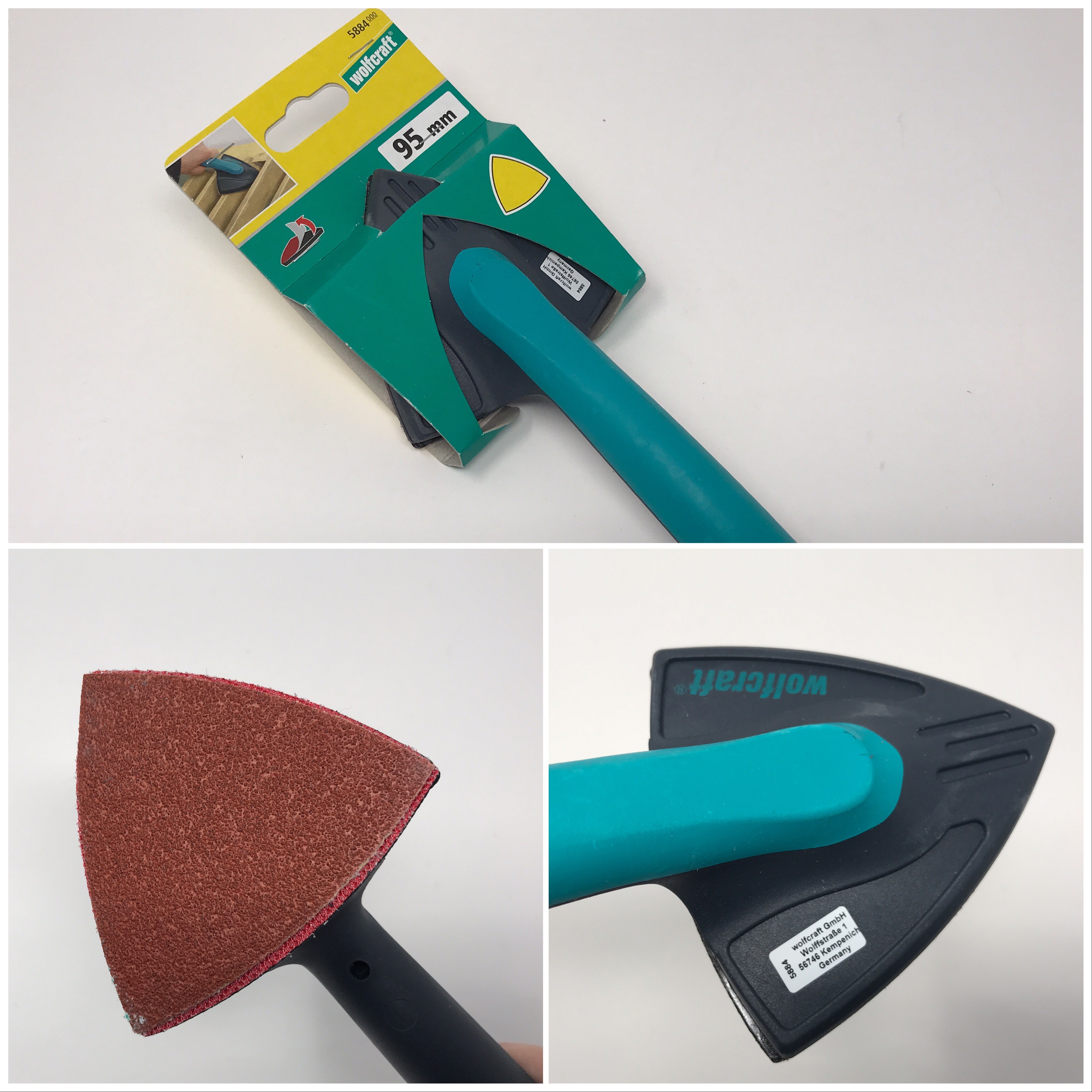 Questa e una levigatrice manuale angolare dotata velcro per il ricambio veloce della carta abrasiva .La levigatrice e fatta in materiale plastico le dimensioni del manico circa di 12 cm e la parte dove viene applicato la carta abrasiva e a forma di triangolo con le punte dei angoli un po’ arrotondate .